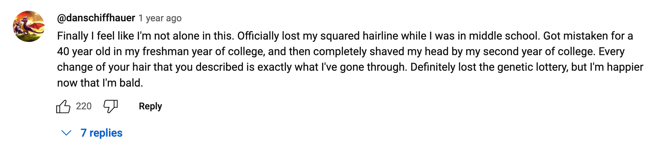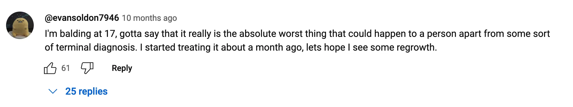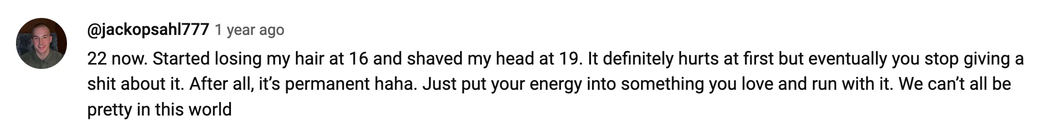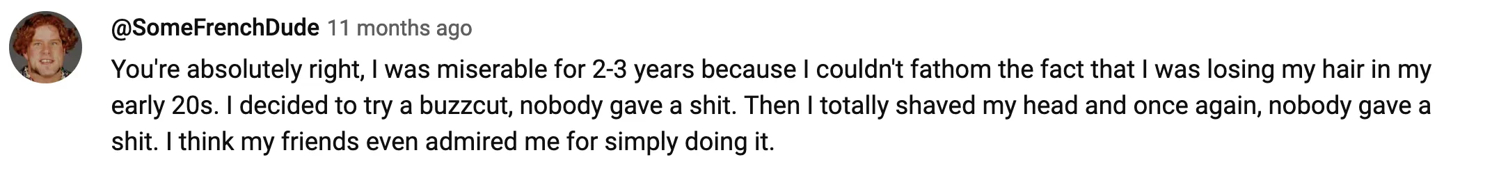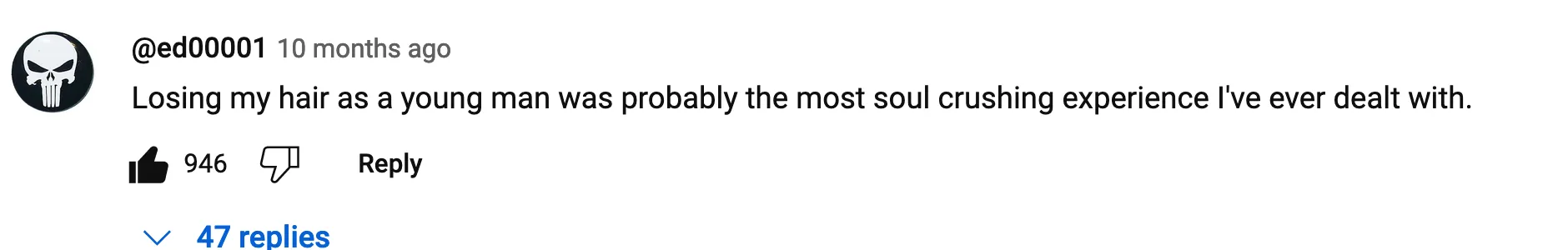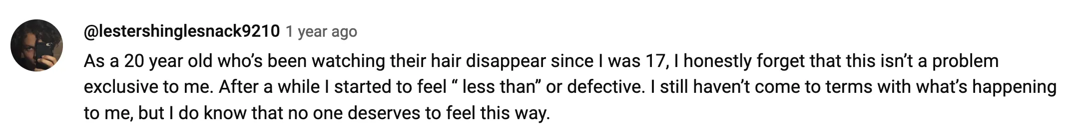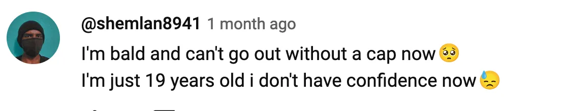 If you have reached here, first of all, thank you for reading so far and thank you for your time. And if you ask me why did I write down all of this, why get vulnerable in front of total strangers and show them you are weak, you have emotions, you feel bad, why show someone you have been rejected, multiple times, right? What’s the purpose of all of this? Well, how I feel, and how I have been feeling for 10 years now, a lot of people are going through the same feeling right now, and for years probably. A lot of people increasingly will feel the same as we are exposed to more chemicals every day. Just go through any Youtube video on balding and see the comments:
